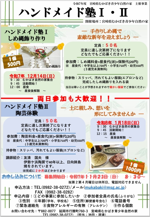 【定員】しめ縄づくり・陶芸 ともに50名ずつ(先着順)