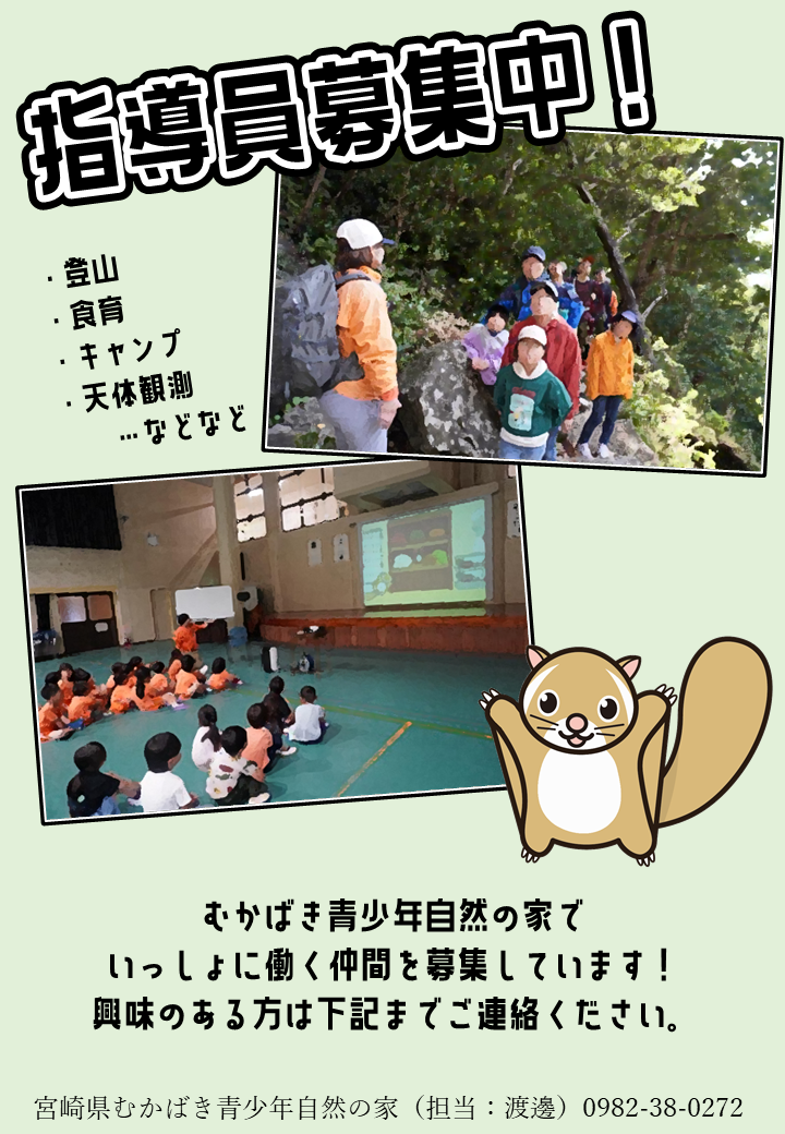 むかばき青少年自然の家では、一緒に働く指導員を募集しています。 人と関わることが好きな方や、自然体験に興味がある方、大歓迎です! 興味のある方はぜひ、下記までご連絡ください。 宮崎県むかばき青少年自然の家 TEL:0982-38-0272 担当:課長代理 渡邊