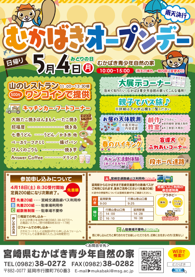 さらに、「宮崎交通 株式会社 様」のご協力により、オープンデーに参加しやすい時刻の便のバスの便がございます。「バスを利用してむかばきまで行ってみたい!」という参加者様がいらっしゃいましたら「路線バス利用枠」にてお申し込みください!路線バスご利用の参加者様特典として、プラホビー無料とファストパス券(プラホビー体験のみ)をプレゼント‼この機会に、家族やお友達とバスを使ってむかばきまで来てみませんか?
